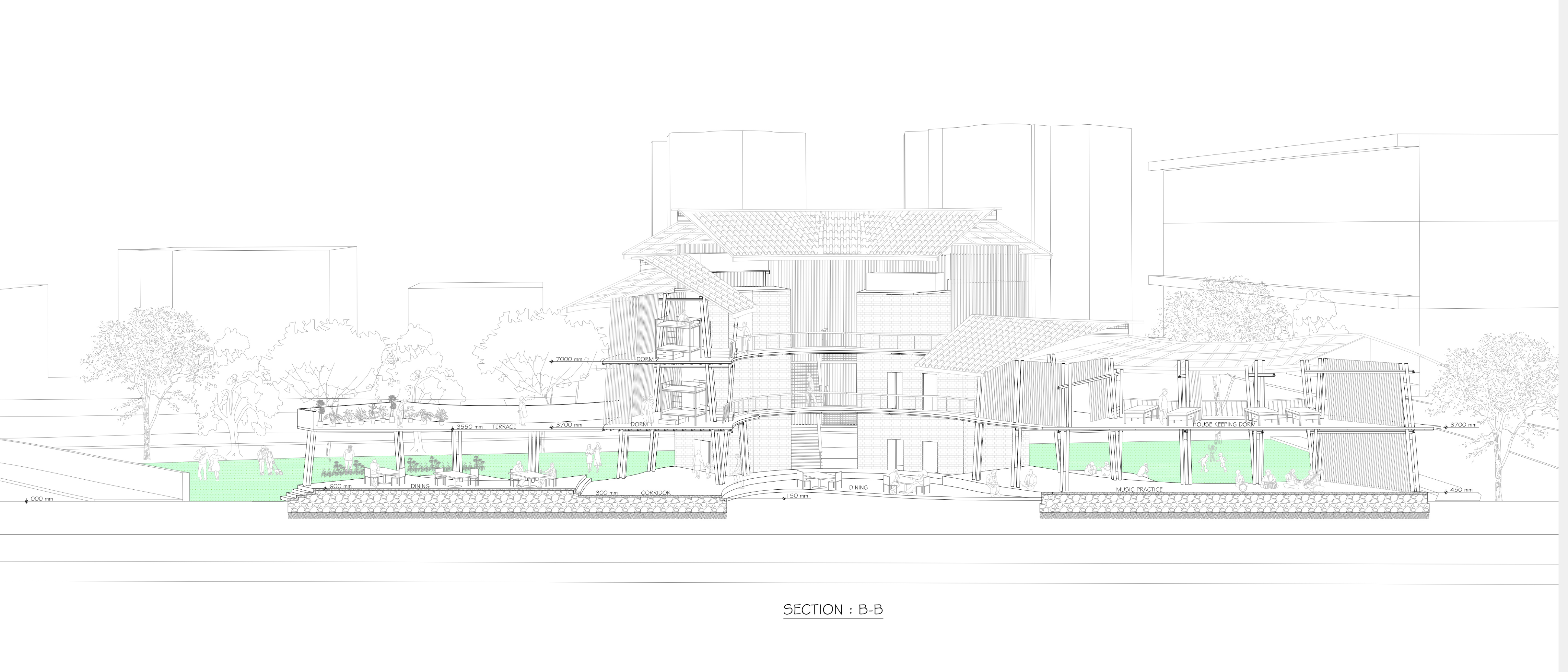 The design structure mainly focuses on the human scale, transparency and modularity of the structure / space. It's an idea of low cost structure which also increases interaction between the people and the surrounding ecosystem. The Artist Centre includes who practice art of everyday scales like cooking, sewing, boutique, gardeners etc.