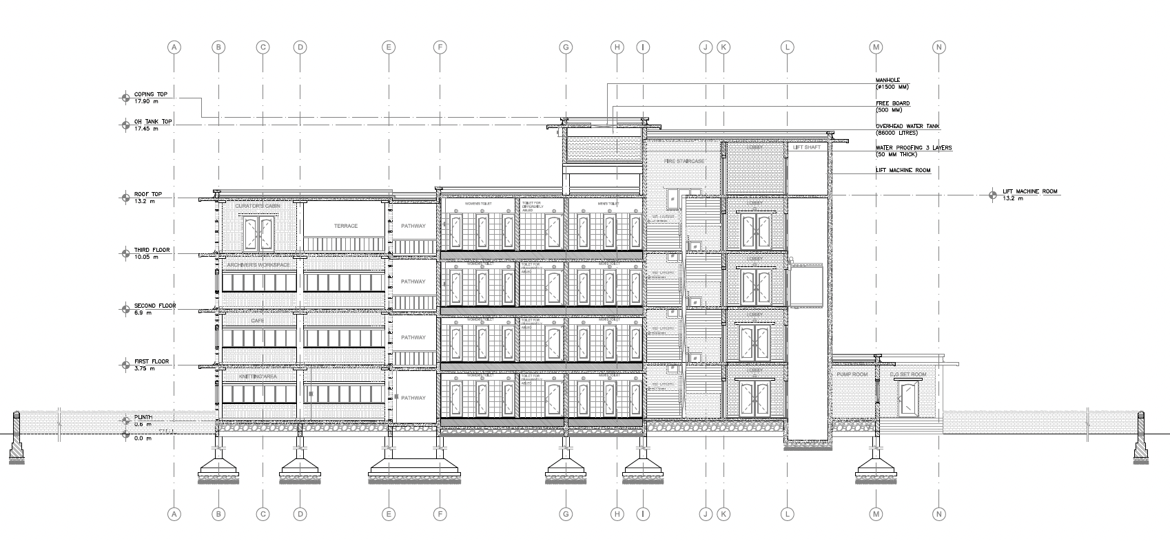 Khushi Bagrecha began by keeping in mind the climate, air movement and visual connectivity, an axis that connects the Jayakwadi dam and the temple were open that created vantage points. Structure on the west is lower and it goes higher on south and south east to allow air flow. Design intent was to build a space where one is constantly connected to the outside. She started working with terraces/ courtyards at different levels to form overlooking spaces, trying to open up spaces to the outside.